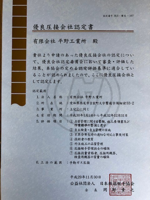 平成30年1月より公益社団法人日本鉄筋継手協会より優良圧接会社認定を取得しました。